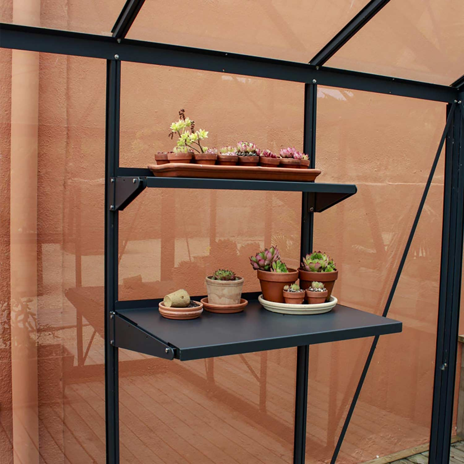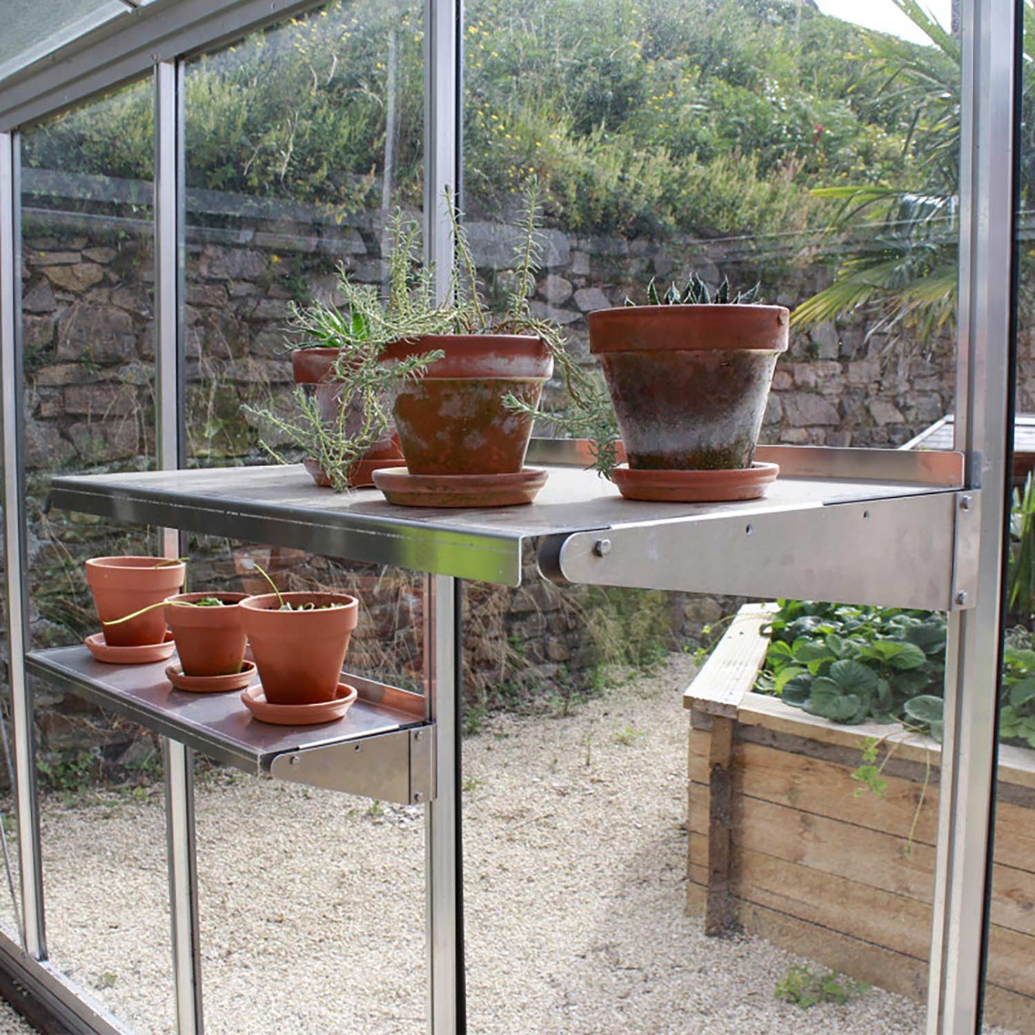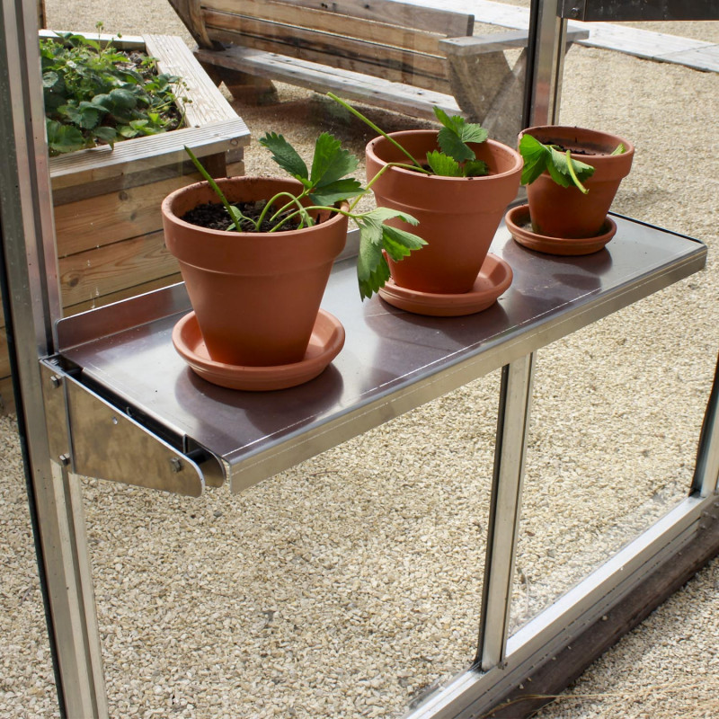 Etagère en aluminium fixée aux profilés de votre serre. Disponible en deux dimensions.