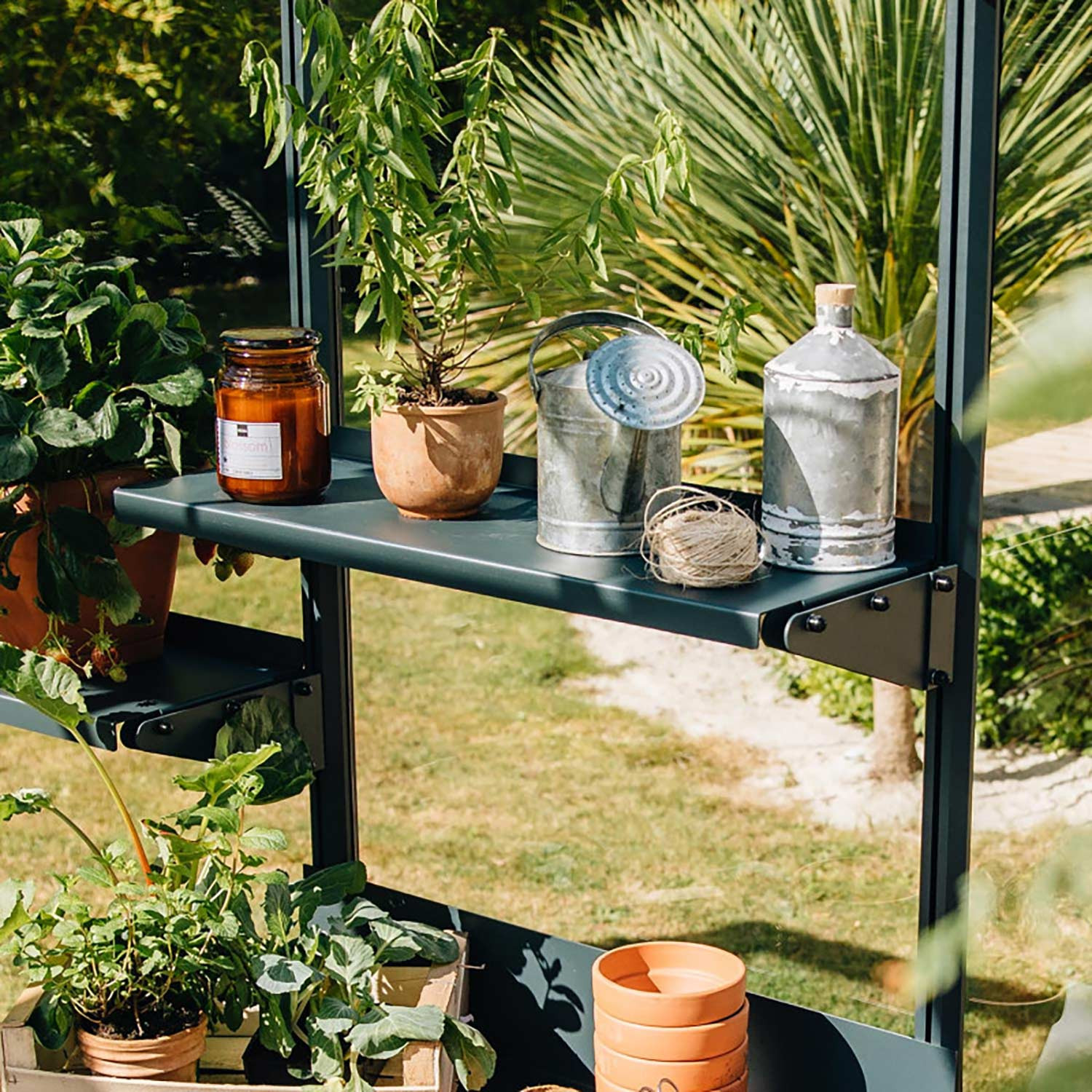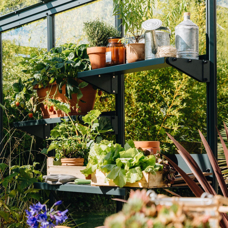 Poser votre étagère en tôle aluminium naturel ou laquée sur les deux consoles fixées aux profilés de votre serre.