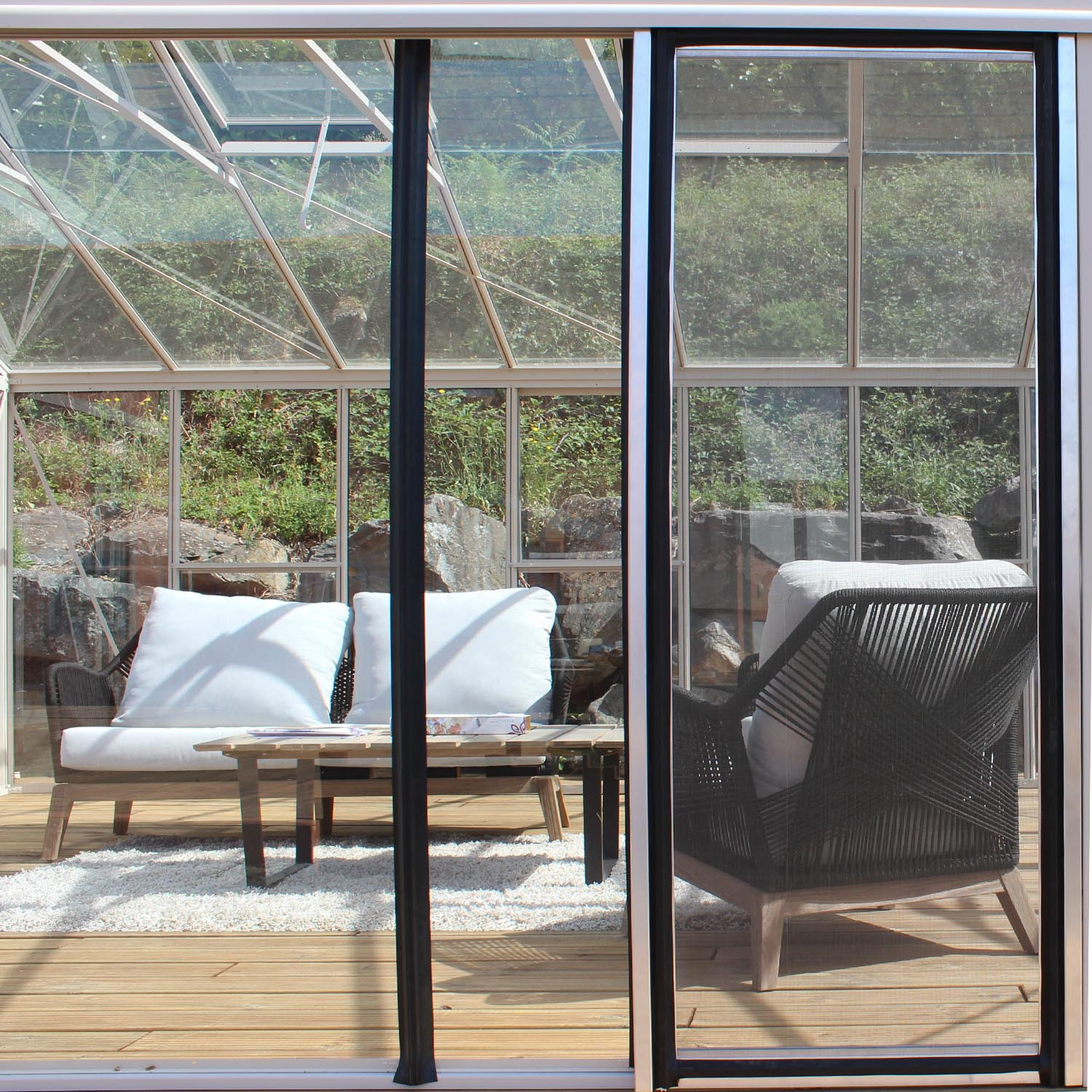 Porte moustiquaire de largeur 0,70 m. La porte se glisse sur les rails de portes existants de la serre.