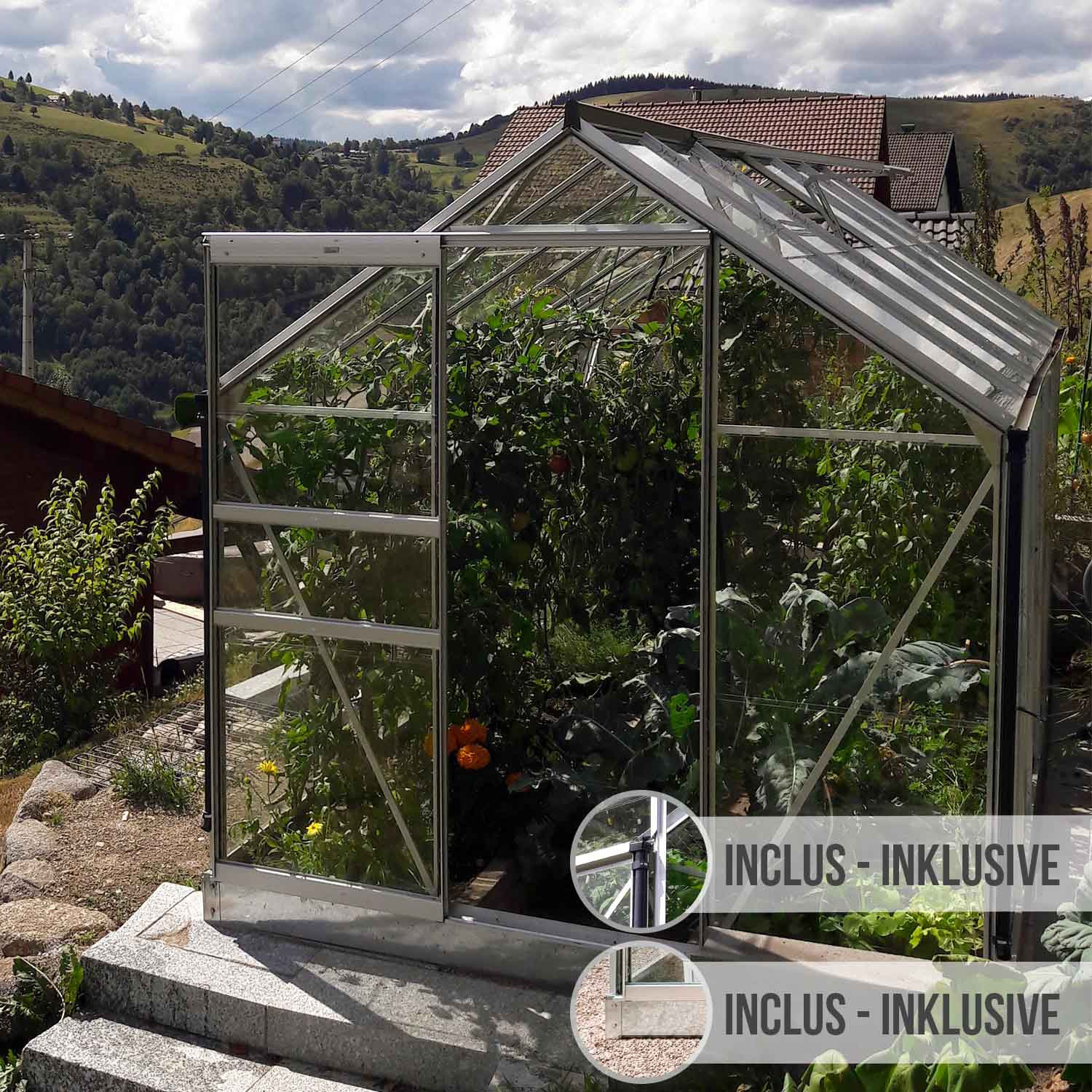 | Base | Incluse, hauteur 12,5 cm - En acier galvanisé et laquée à la couleur de la serre |
