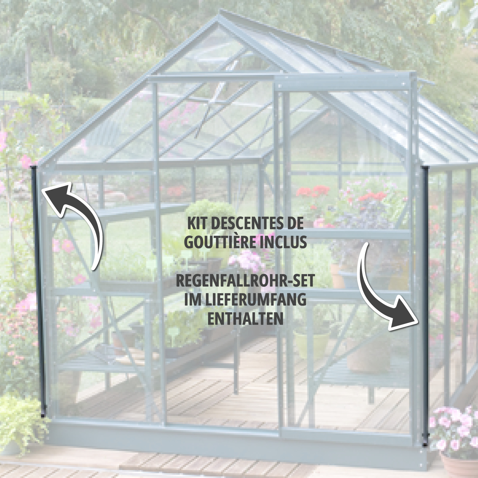 - 1 kit de descentes de gouttière (deux connecteurs et descentes) est inclus avec votre serre de jardin LAMS. Ajustez la descente en hauteur selon vos besoins : Vous pourrez ainsi installer un récupérateur d'eau de pluie.