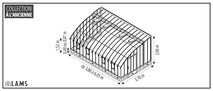 LAMS, fabricant spécialiste de la serre et du jardin d´hiver depuis plus de 30 ans, met son savoir-faire à votre service : trouvez la serre qui vous convient dans notre large collection de serres de qualité conçues et fabriquées dans nos ateliers en Vendée. Tout à la fois une serre de culture, un abri pour vos plantes et un charmant jardin d'hiver tout en transparence, la serre à l'ancienne CHAMBORD de largeur 3,70 m LAMS vous invite à cultiver la douceur de vivre. Pour votre serre, nous avons sélectionné des matériaux de qualité :