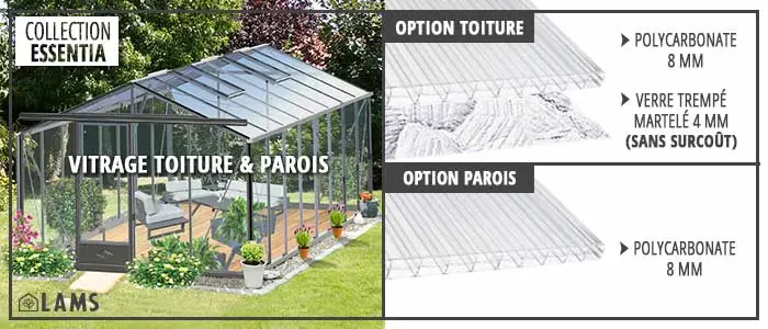 Polycarbonate en vitrage de toiture et/ou de paroi : Optez pour du polycarbonate de 8 mm d'épaisseur pour les parois et/ou le toit (option en surcoût). Le polycarbonate protège vos plantes d'une trop forte exposition au soleil et offre une isolation élevée. Mais les panneaux de polycarbonate sont plus sensibles aux égratinures, jaunissent au fil du temps et, comme le verre martelé, sont moins esthétiques..