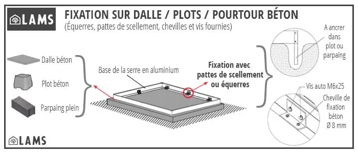 | Fixation de la serre au sol | Plots, pourtour ou dalle béton (pieds d'ancrage inclus) - Plan de maçonnerie fourni |