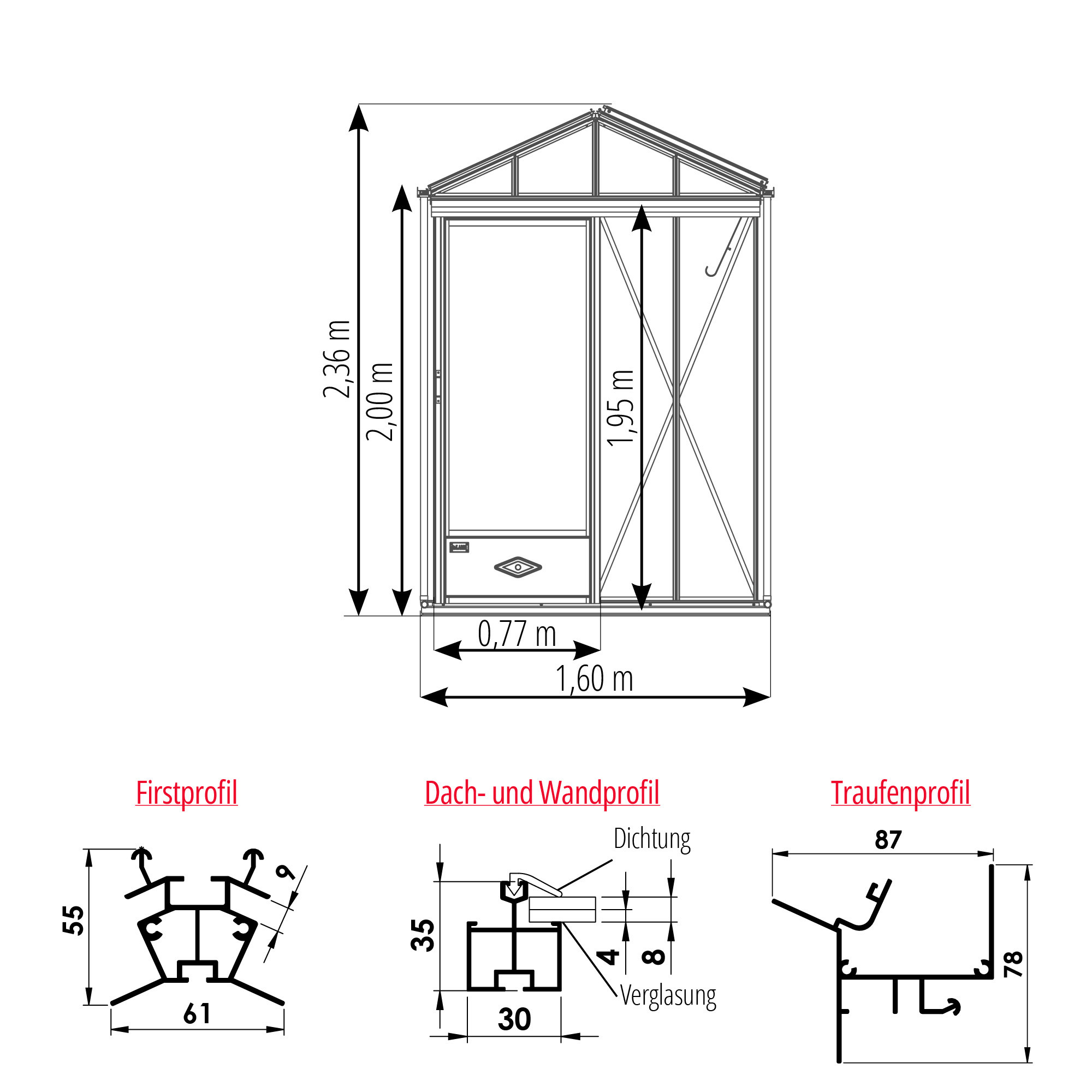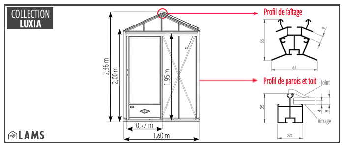 Dimensions de la serre de jardin LUXIA Rétro avec une largeur de 1,60 m