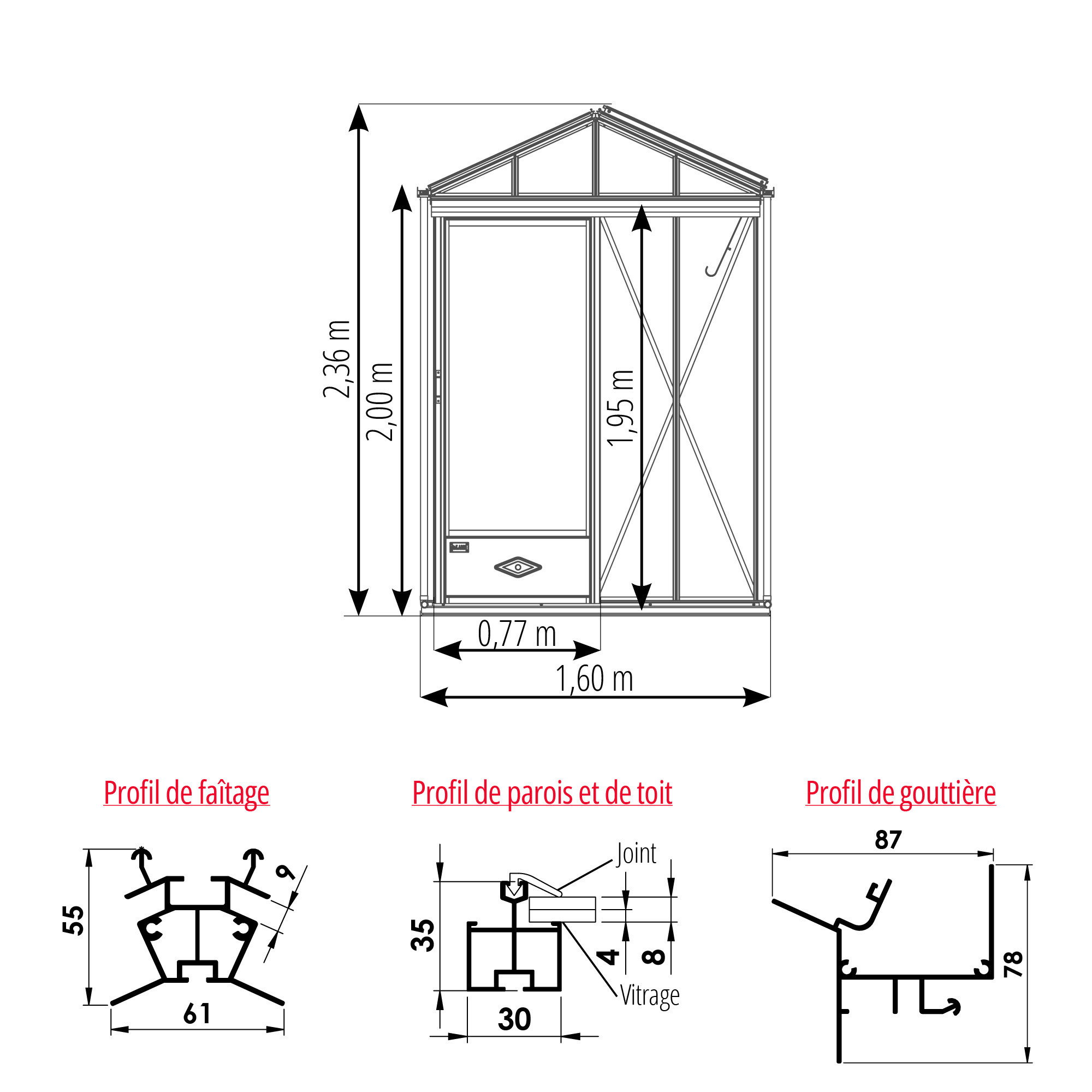Avec une largeur de 1,60 m, la serre en verre trempé et aluminium LUXIA rétro est disponible en 3 longueurs : 1,60 m - 2,36 m - 3,09 m.