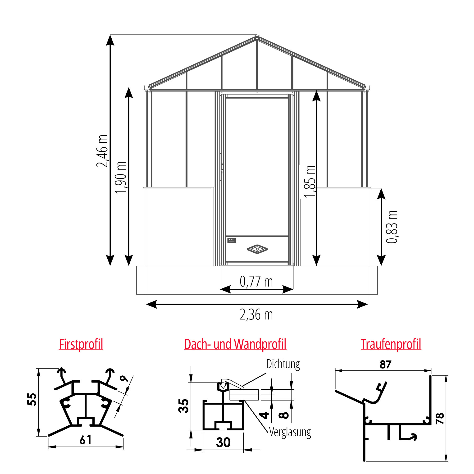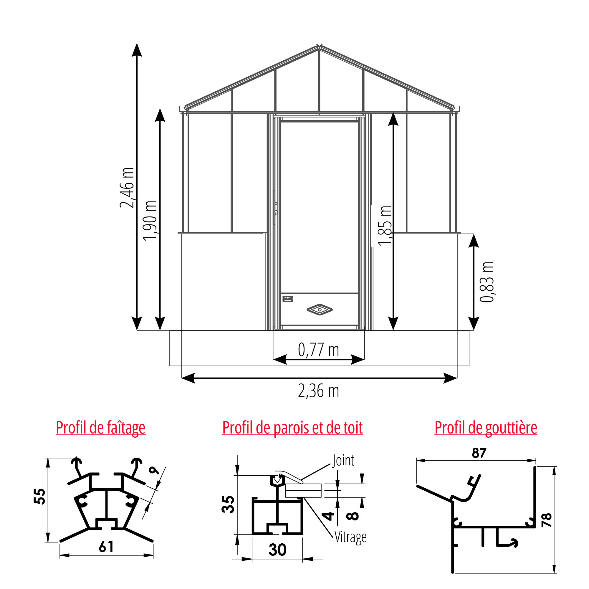 Dimensions de la serre de jardin LUXIA Rétro sur muret avec une façade de 2,36 m
