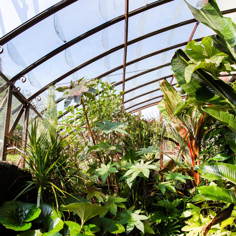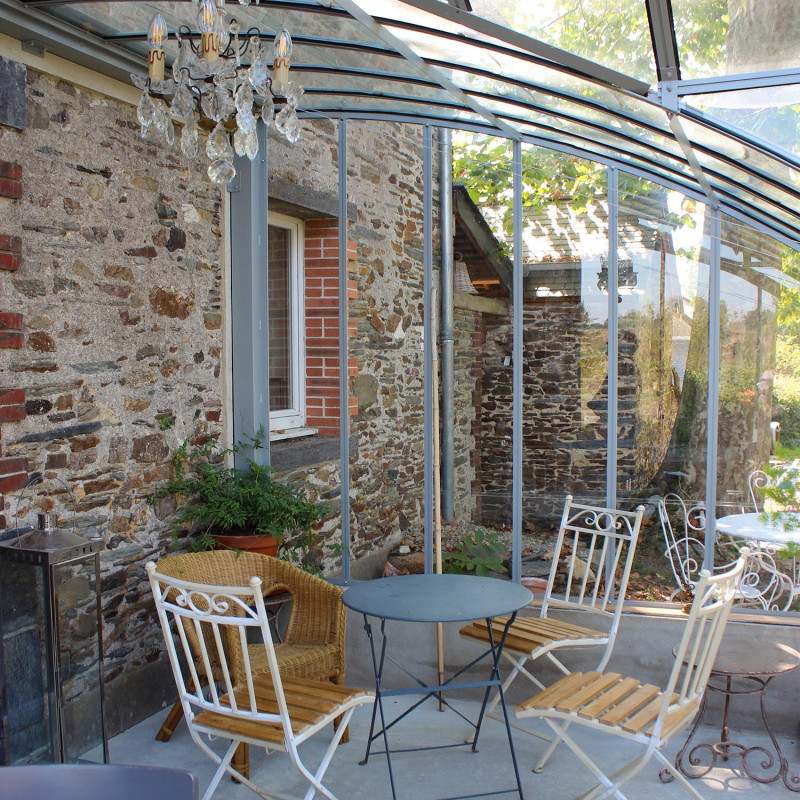 Le vitrage en verre trempé de 4 mm d'épaisseur est fixé par des clips en inox pour une pose facile. La toiture arrondie est composée de petites tuiles en verre trempé pour préserver le charme des serres d'autrefois.