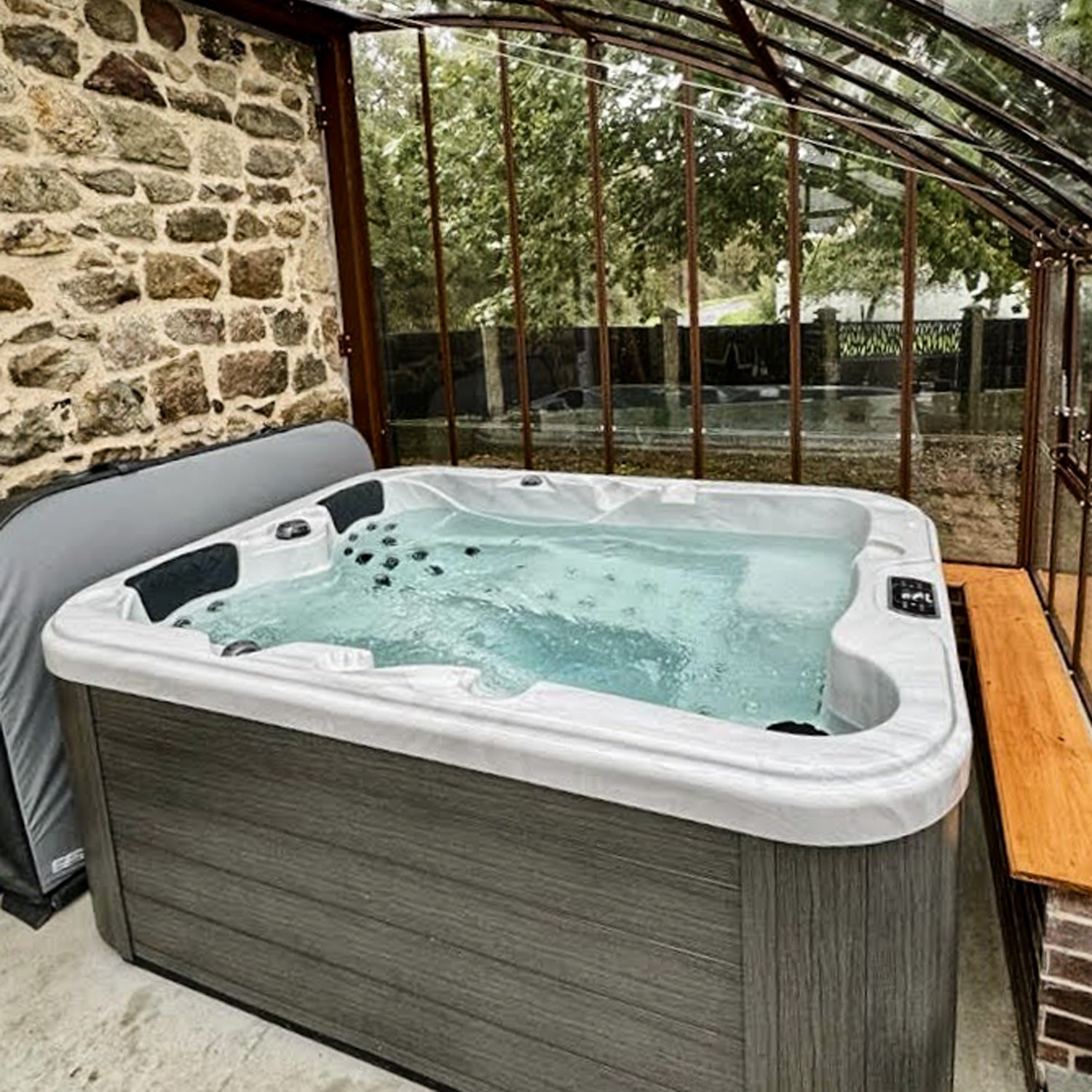 - Une structure en aluminium laqué (coloris RAL au choix), de la visserie en inox et d'un vitrage en verre trempé de 4 mm d'épaisseur.