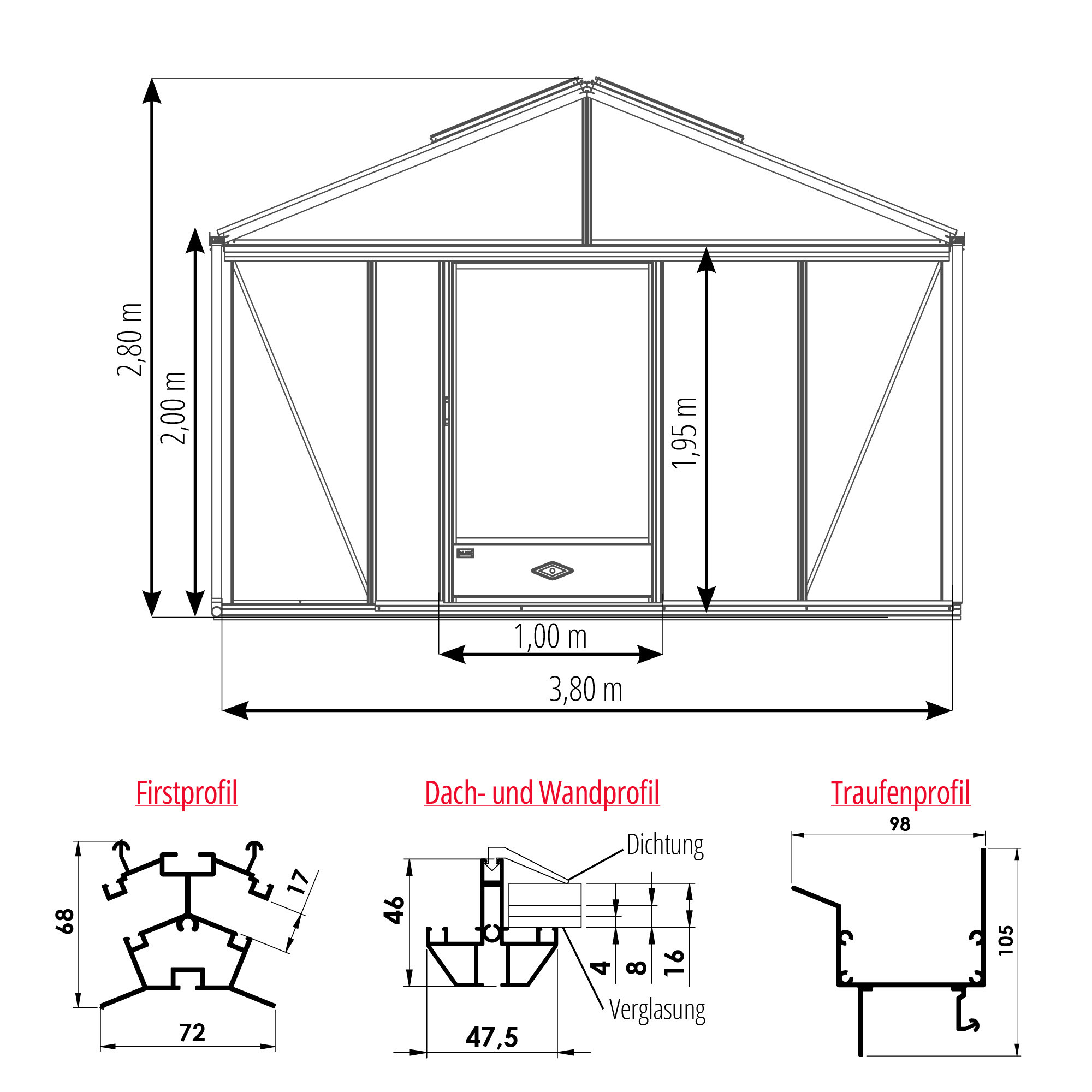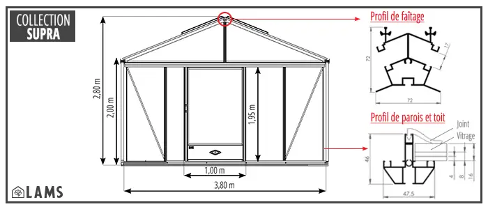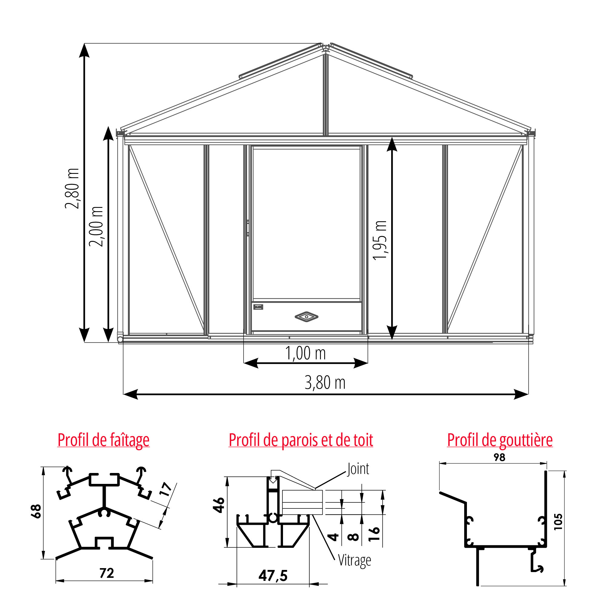Dimensions de la serre de jardin SUPRA avec une façade d'3,80 m