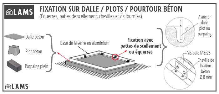 | Fixation de la serre au sol | Plots, pourtour ou dalle béton (pieds d'ancrage inclus) - Plan de maçonnerie fourni |
