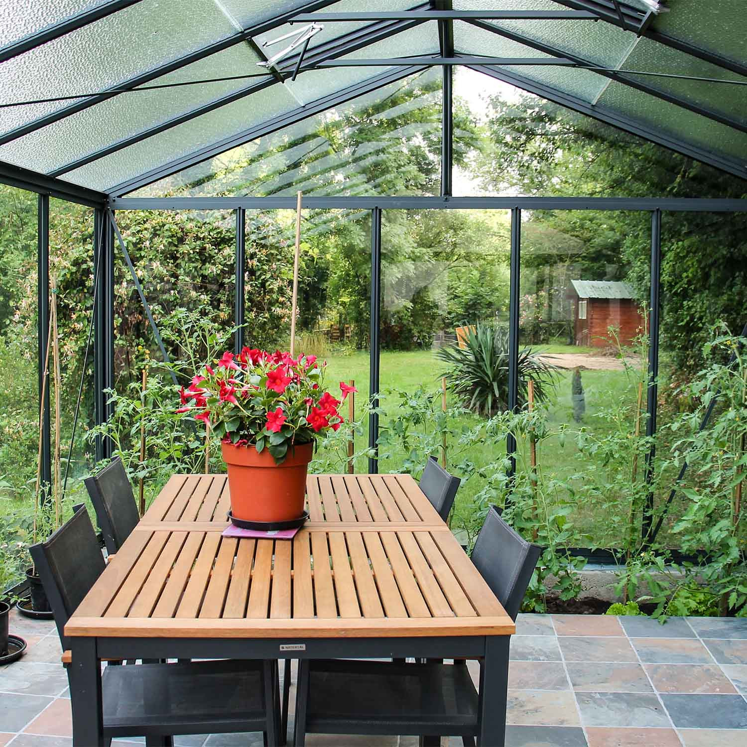 Avec une façade de 3,80 m, la serre en verre trempé et aluminium SUPRA est disponible en 6 longueurs de 4,57 m à 8,30 m.