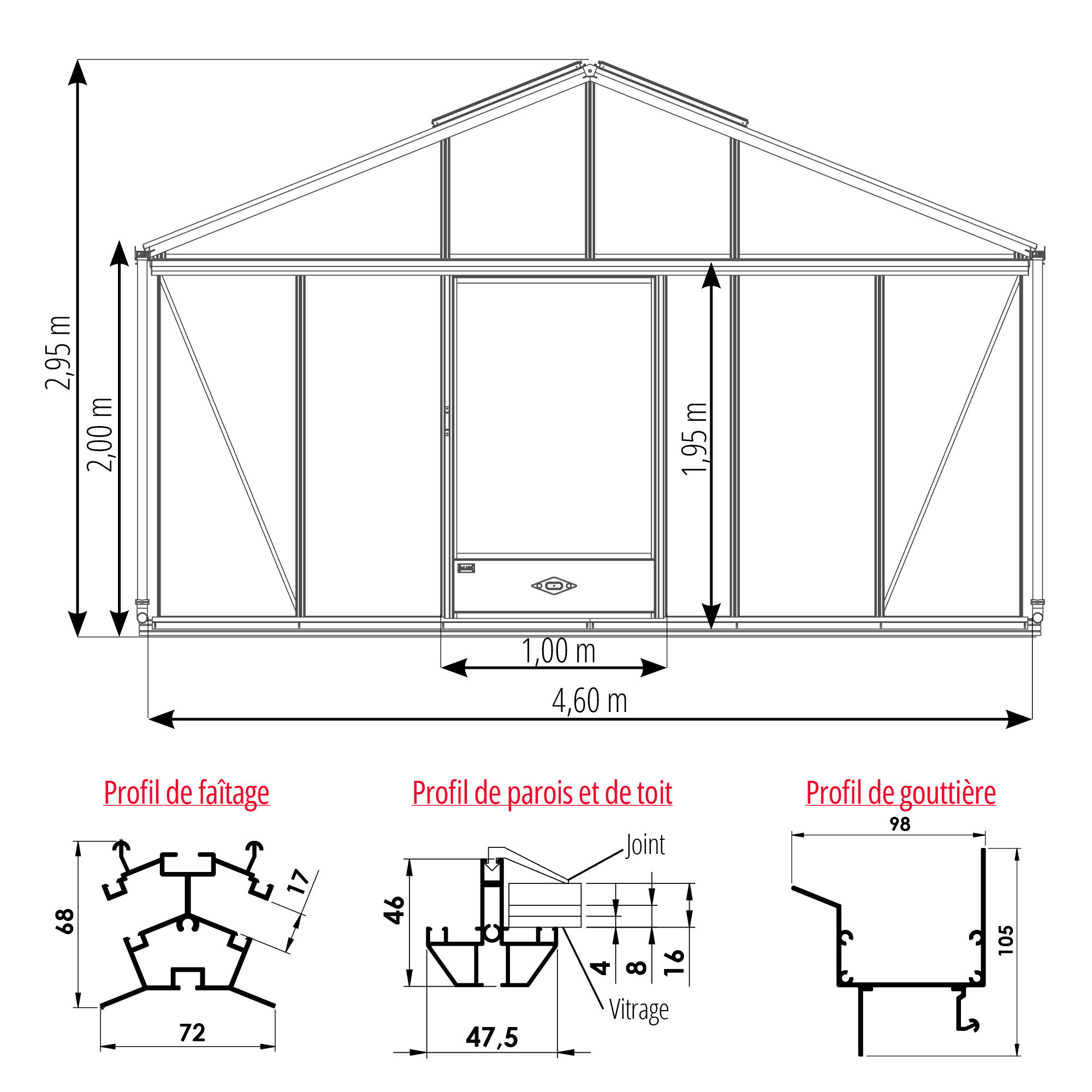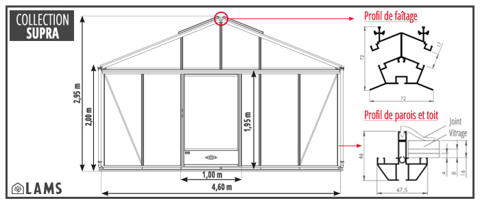 Dimensions de la serre de jardin SUPRA avec une façade d'4,60 m