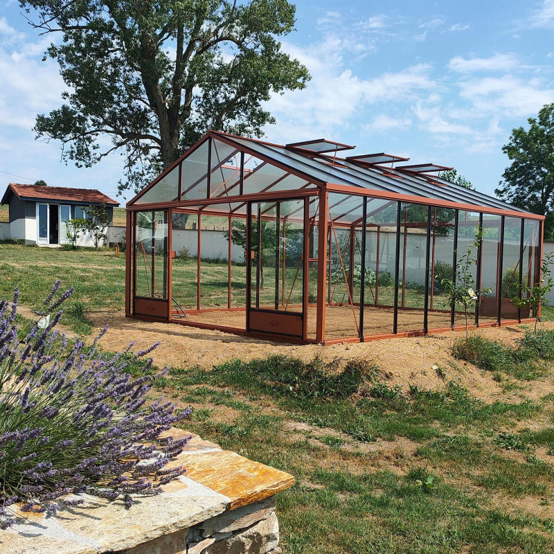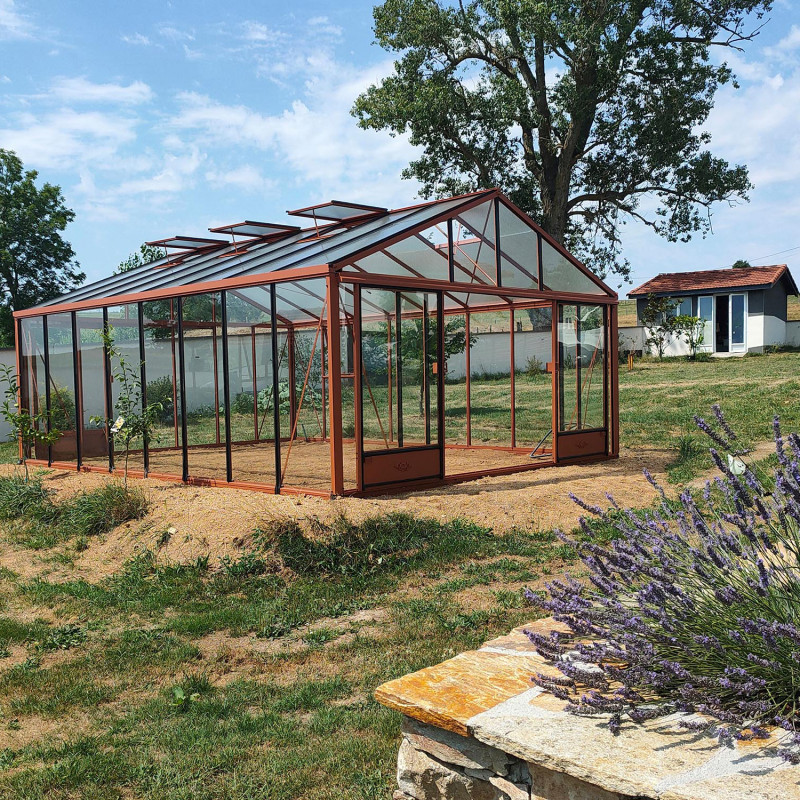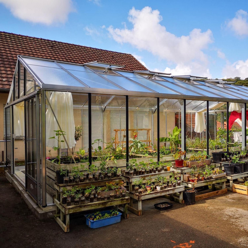 Avec une façade de 4,60 m, la serre en verre trempé et aluminium SUPRA est disponible en 5 longueurs de 5,30 m à 8,30 m.