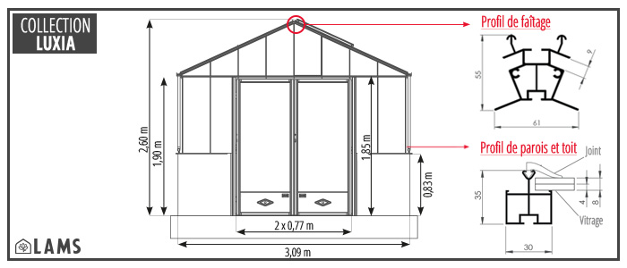Met een breedte van 3,09 m is de gehard glas en aluminium LUXIA retro serre op muurtje beschikbaar in 5 lengtes: 3,09 m - 3,80 m - 4,57 m - 5,30 m - 6,04 m.