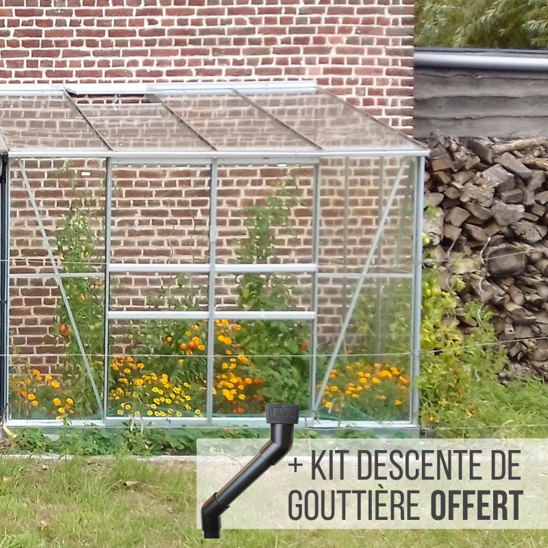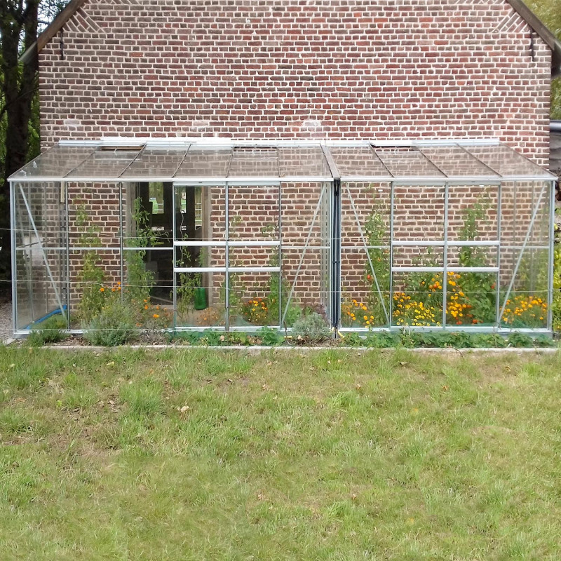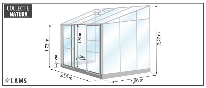 De structuur van de aanleunende Lams serre is in aluminium, 10 jaar gegarandeerd. Aluminium, een materiaal dat een lange levensduur garandeert, vereist geen speciaal onderhoud. De wanden zijn gemaakt uit 3 mm gehard glas voor meer veiligheid.